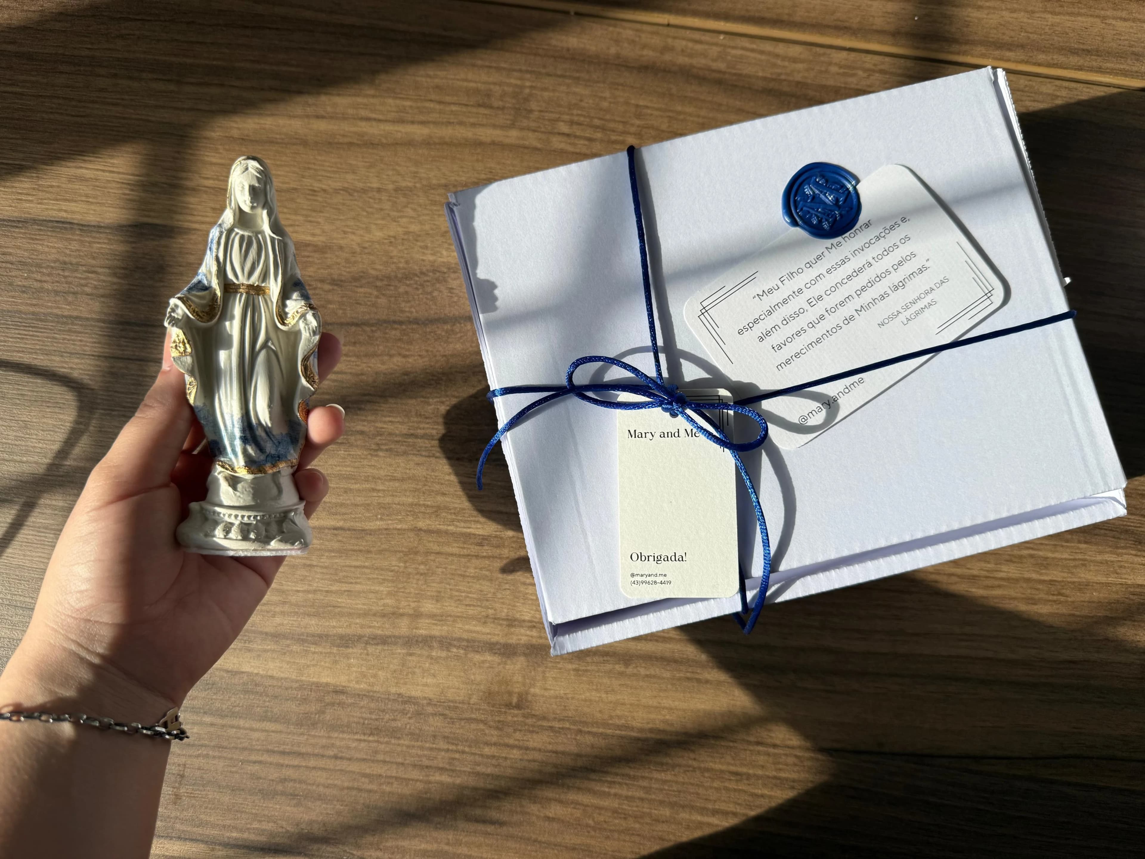 A Mary and Me nasceu do amor pela arte sacra e pela vontade de criar peças únicas que carregam fé e beleza. Cada santa é cuidadosamente moldada e decorada com a técnica de decoupage, usando estampas selecionadas que trazem delicadeza e personalidade. Nossos terços são montados à mão, conta por conta, com materiais de qualidade e muito carinho.